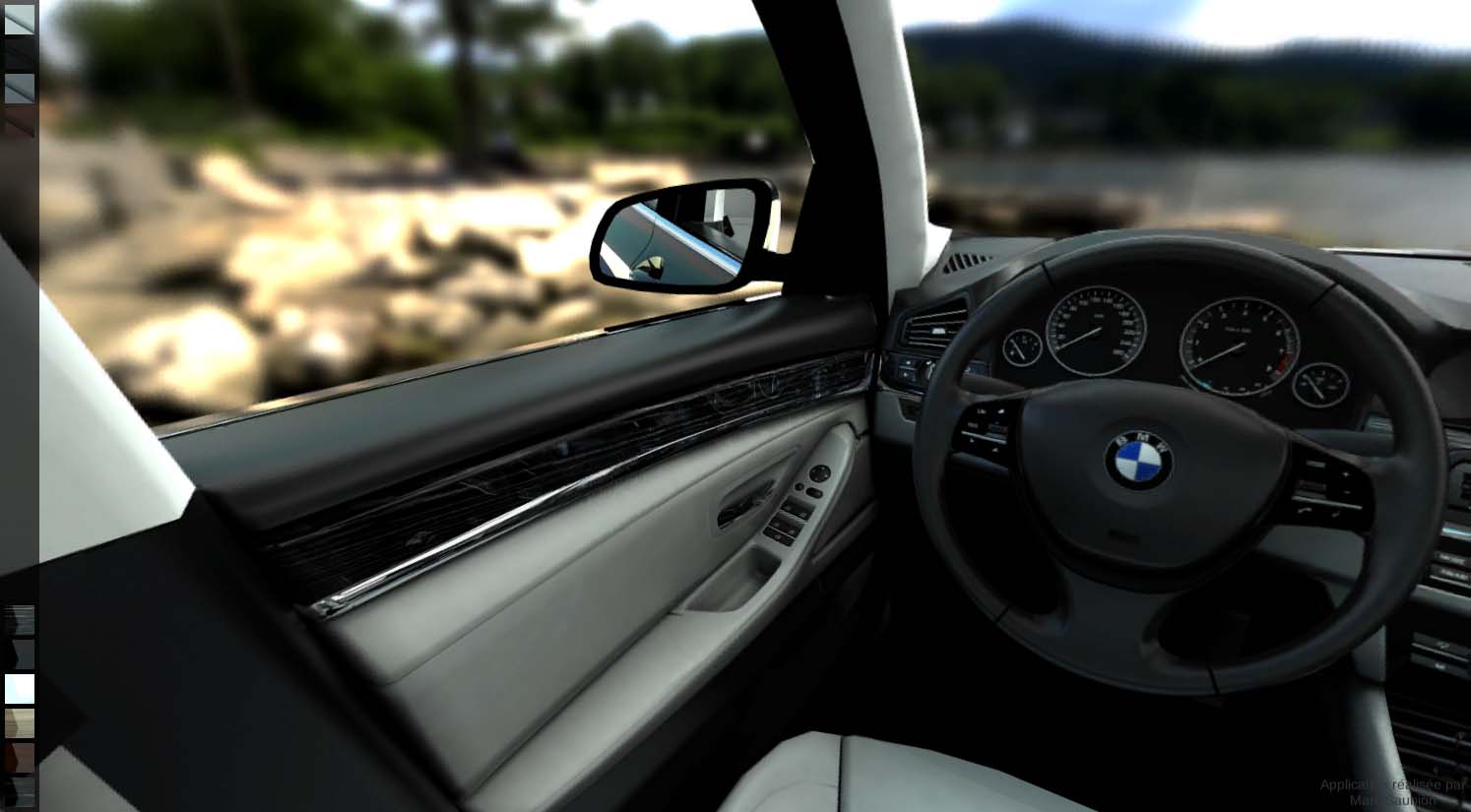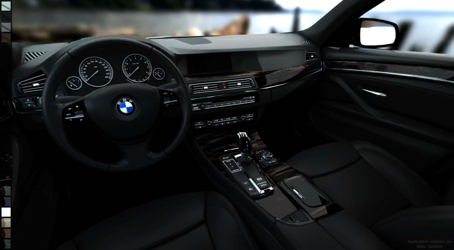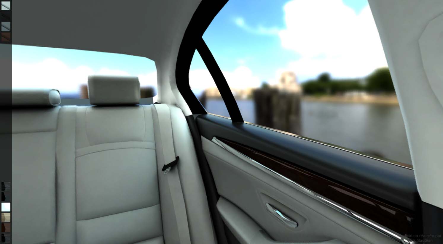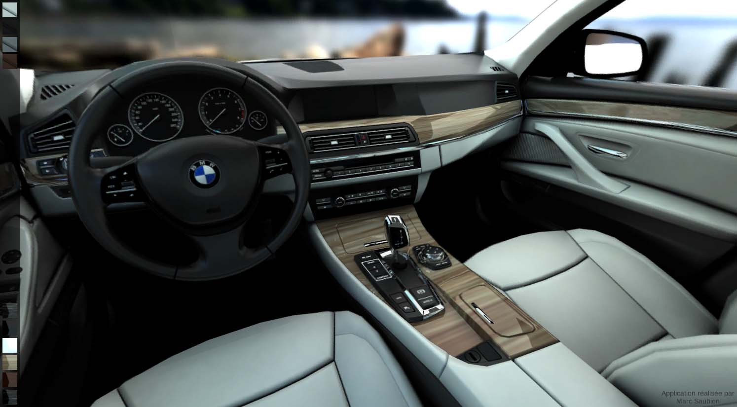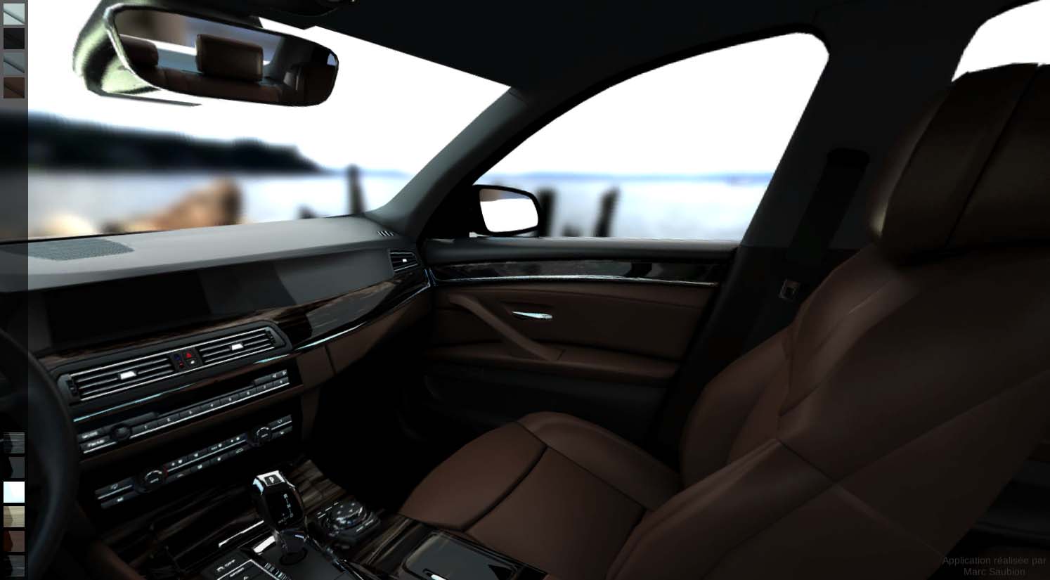 Dans l’exemple ci dessus, il est possible de visualiser à 360° l’intérieur d’une BMW série 5 en alternant à l’envie les combinaisons de couleurs et matériaux tout en conservant une qualité photoréaliste.